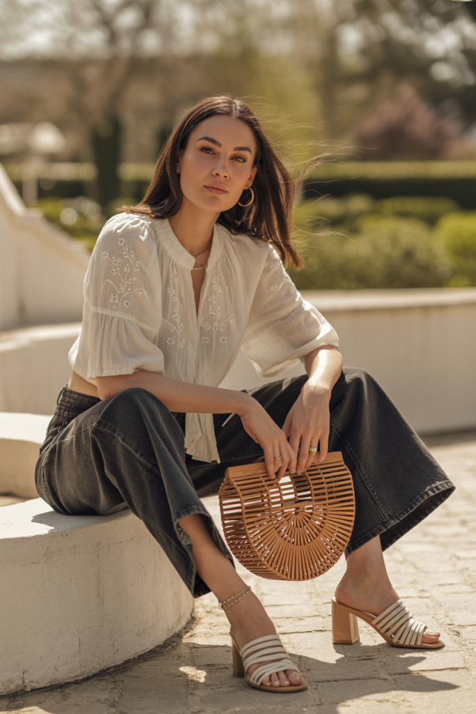 Embrace a bohemian-inspired casual chic look with an embroidered blouse. Look for intricate floral or geometric embroidery on a light, airy fabric. Pair it with well-fitting dark-wash jeans, perhaps with a slight distressed detail for an added casual edge. Finish the outfit with block-heeled sandals or stylish ankle boots, and a fringed or woven bag.