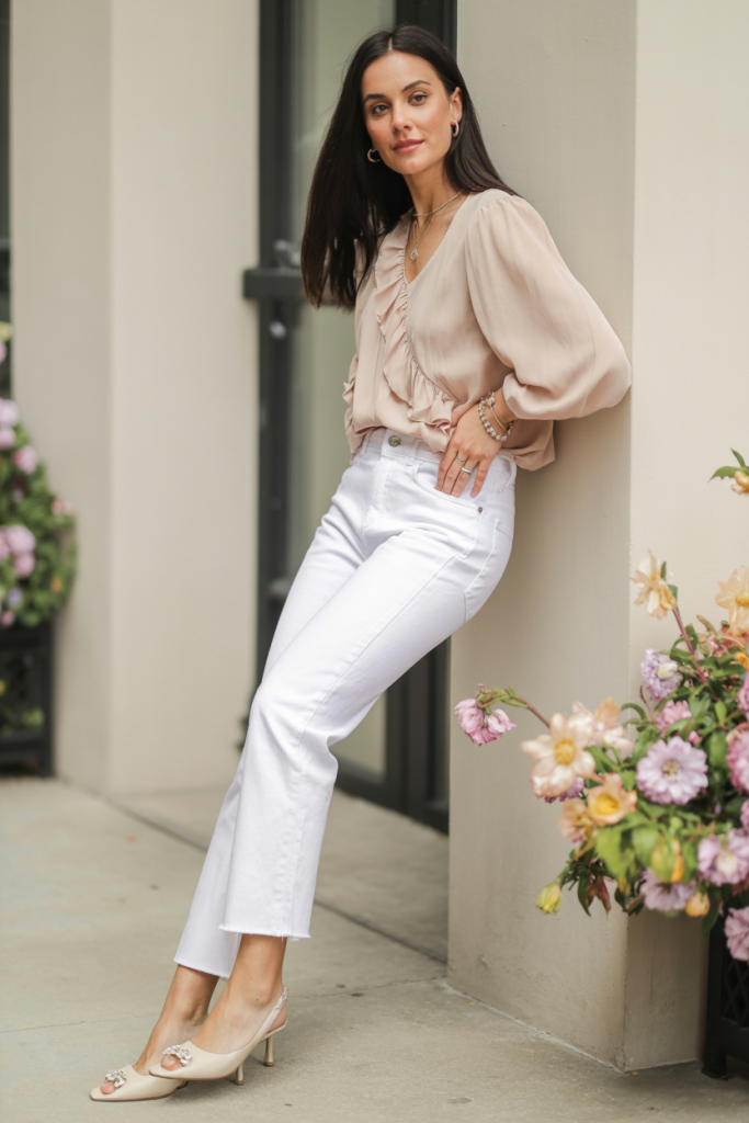 6. White Jeans and Ruffled Blouse
