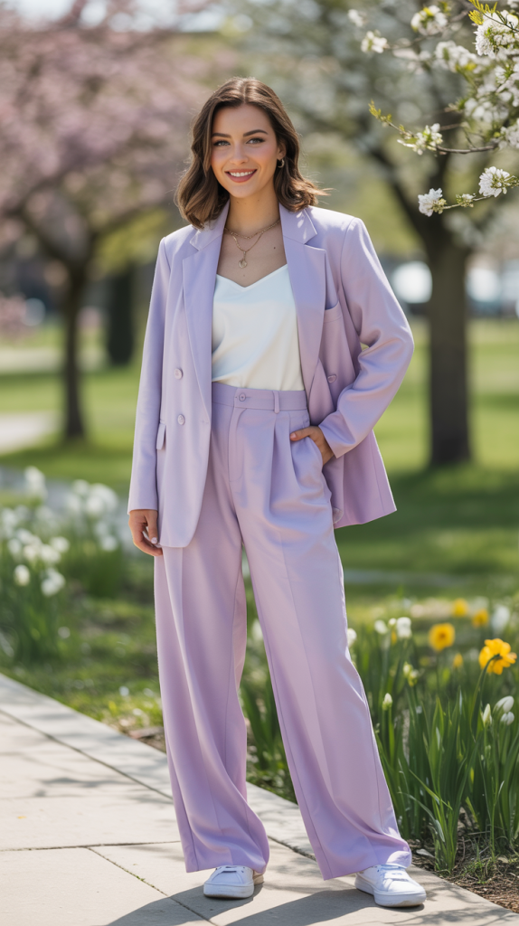 Elevate your casual look with a relaxed-fit pastel power suit. Opt for soft hues like mint green, lavender, or baby blue. Pair the blazer and trousers with a simple white camisole or a lightweight knit top underneath for a fresh, modern feel. This ensemble strikes the perfect balance between sophisticated and comfortable. Complete the look with crisp white sneakers for a truly casual vibe, or low block heels for a slightly dressier touch.