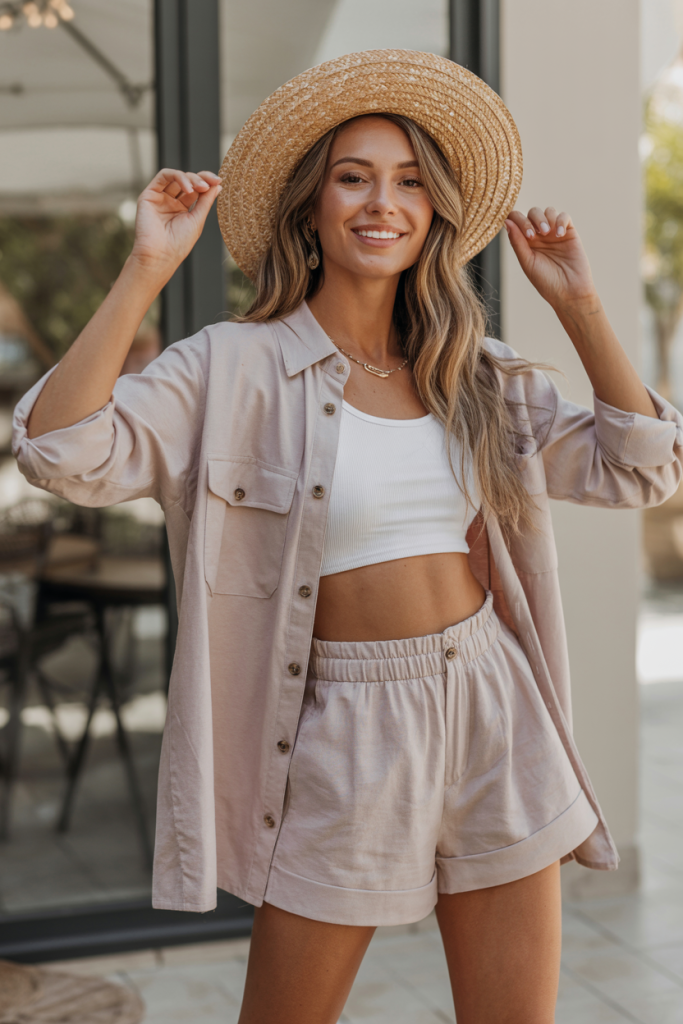 Nothing says spring comfort like linen blend separates. A matching set consisting of a relaxed-fit button-down shirt and tailored shorts or capri pants in a breathable linen blend is perfect for a warm Easter day. Choose natural tones or soft pastels. Wear the shirt untucked or half-tucked for a laid-back feel. Accessorize with a wide-brimmed straw hat and comfortable slides or flat espadrilles.