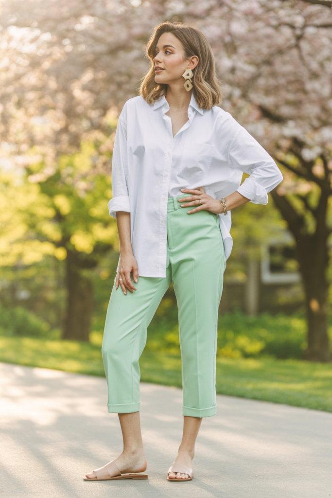 Tailored capri pants are making a stylish comeback. Choose them in a vibrant spring color like coral or turquoise, or stick to classic neutrals. Pair them with an oversized white or light-colored button-down shirt, worn loose or tied at the waist. This creates a relaxed yet sophisticated silhouette. Accessorize with statement earrings and comfortable flat sandals or espadrilles.