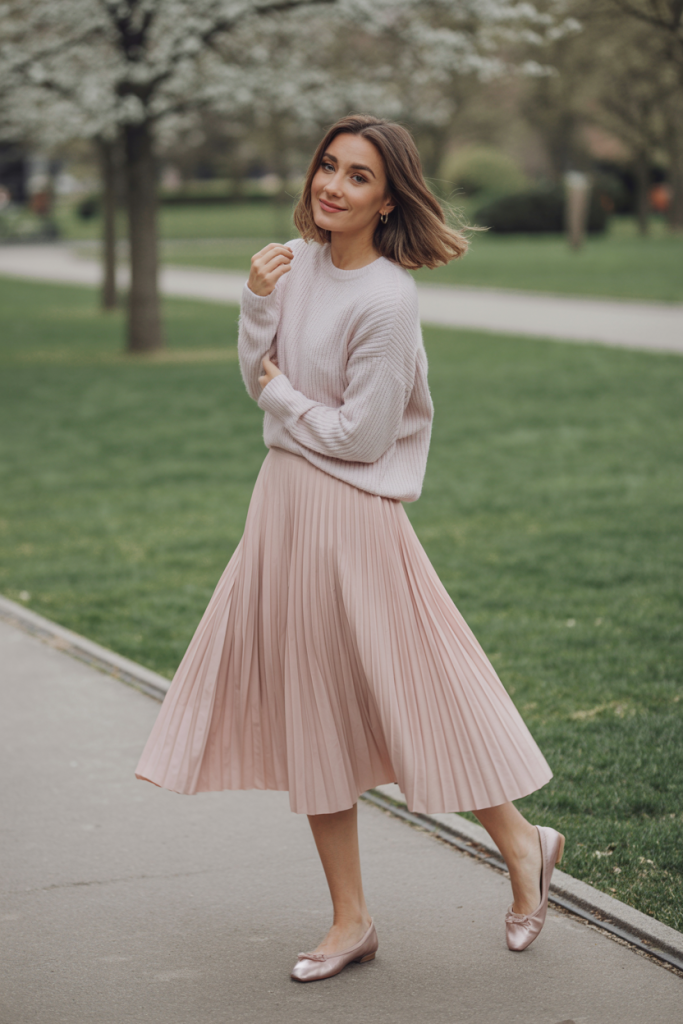 A pleated midi skirt in a pastel shade or a subtle floral pattern offers both elegance and comfort. Pair it with a lightweight knit sweater, either tucked in or half-tucked, for a cozy yet chic ensemble. This outfit is perfect for cooler spring mornings or evenings. Finish the look with classic ballet flats or low-heeled pumps for a refined touch.