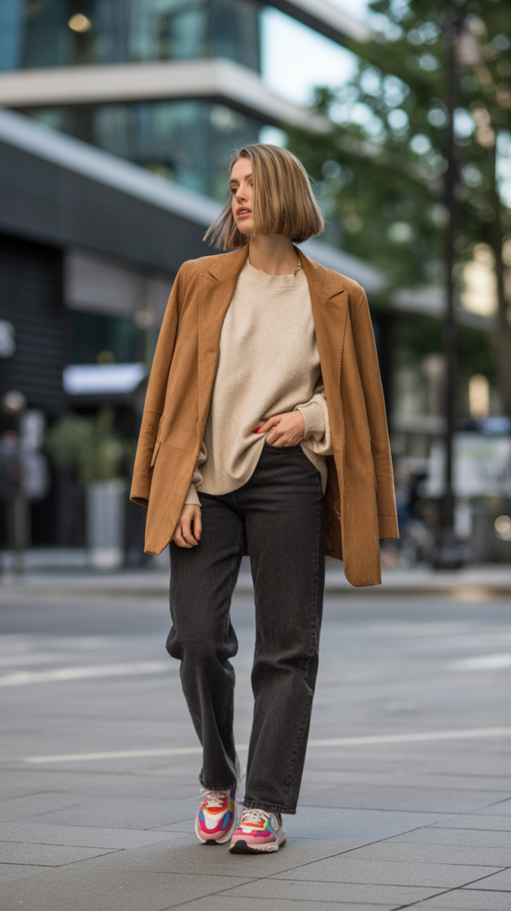 For a smart-casual approach, an oversized faux suede blazer provides warmth and texture. Layer it over a cashmere boyfriend sweater and pair with straight-leg jeans. Inject a playful yet chic element with bright, bold low-top trainers. This outfit demonstrates how to incorporate a pop of color into an otherwise neutral, sophisticated palette, perfect for a stylish weekend.