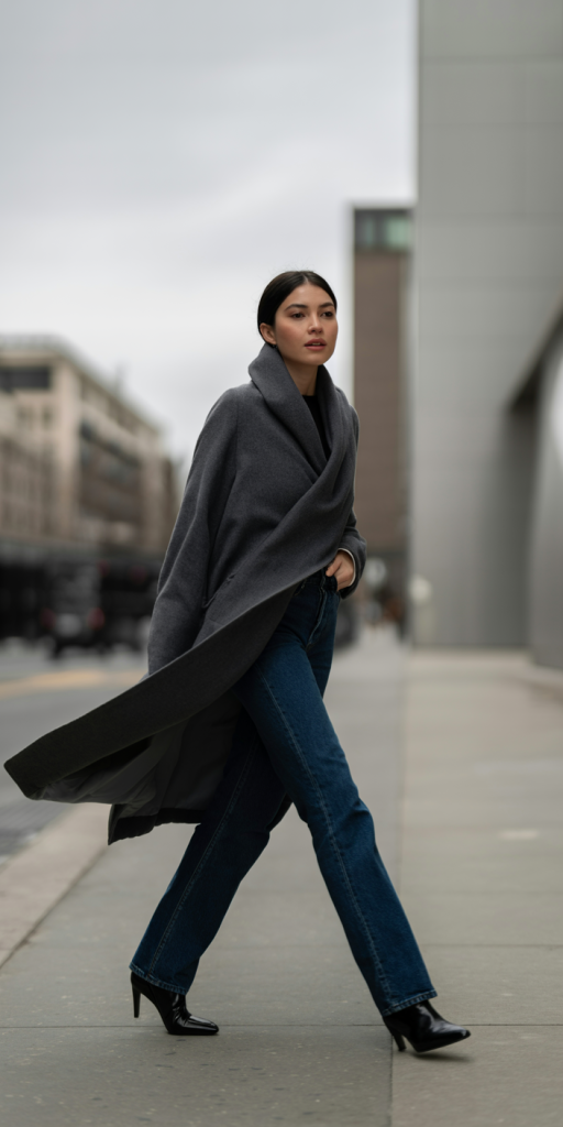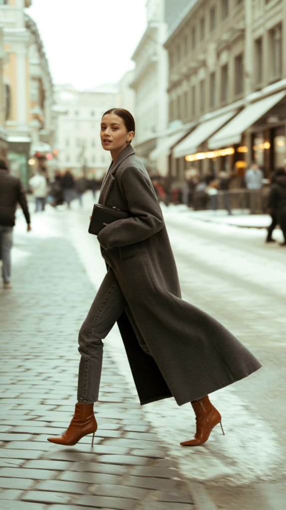 A maxi coat in a luxurious fabric like wool or cashmere is the epitome of winter elegance. Combine it with slim-leg jeans and pointed heeled sock boots. This combination creates a long, lean silhouette that is both flattering and incredibly chic. The pointed boots add a touch of sharpness, making the entire look feel refined and put-together.