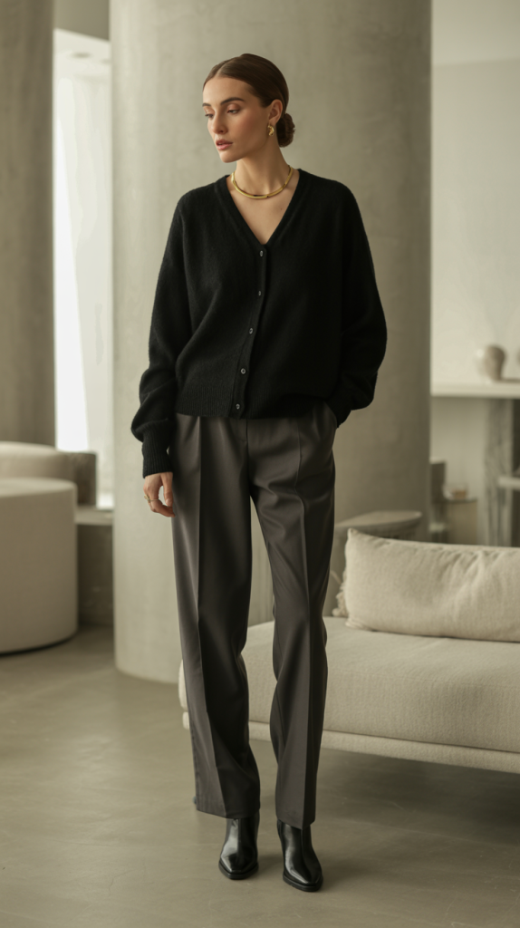 For ultimate comfort and undeniable luxury, a cashmere cardigan (like a classic Khaite style) is a must-have. Wear it buttoned up as a top or layered over a silk camisole. Pair with tailored trousers in a complementary color and black ankle boots. This outfit exudes quiet luxury and is perfect for a sophisticated office look or an elegant dinner out.