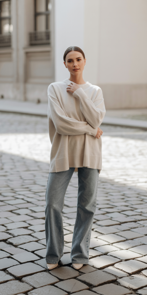 Embrace comfort without sacrificing style with an oversized cashmere or wool jumper paired with barrel-leg jeans. This silhouette offers a modern yet relaxed feel. Complete the look with ballet flats for an understated touch of grace. The juxtaposition of the voluminous top and unique jean cut creates an intriguing and effortlessly chic aesthetic. Opt for neutral tones like cream, camel, or charcoal for maximum versatility.
