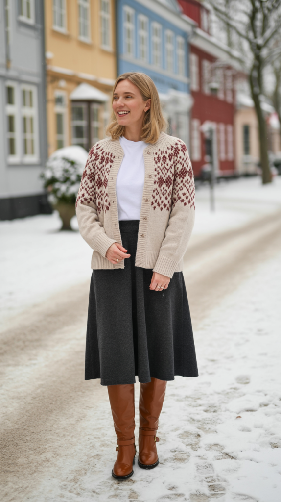 Embrace a cozy yet sophisticated aesthetic with a Fair Isle knit cardigan. Layer it over a simple white t-shirt and pair with a structured midi skirt. Complete the look with knee-high boots for an outfit that is both warm and stylish. This ensemble is ideal for a refined daytime look or a casual office environment.