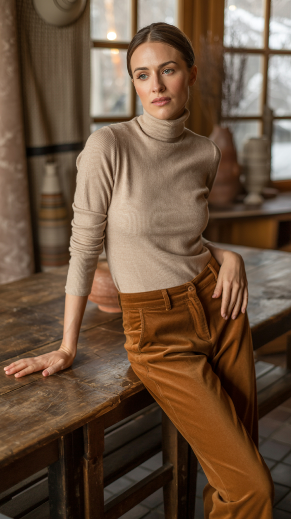 A timeless rollneck sweater in a fine knit is a versatile foundation. Pair it with corduroy straight-leg pants for a touch of vintage-inspired texture and warmth. Finish with ankle booties and delicate hoop earrings. This outfit is comfortable, chic, and perfect for everyday elegance, offering a subtle nod to classic winter fashion.