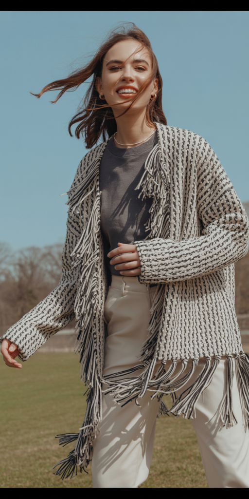 Styling Tip: The movement of the fringe is the star. Style a fringe-detailed cardigan over a monochromatic outfit (e.g., all black or all white) to ensure the texture and motion of the knit are the main focus.