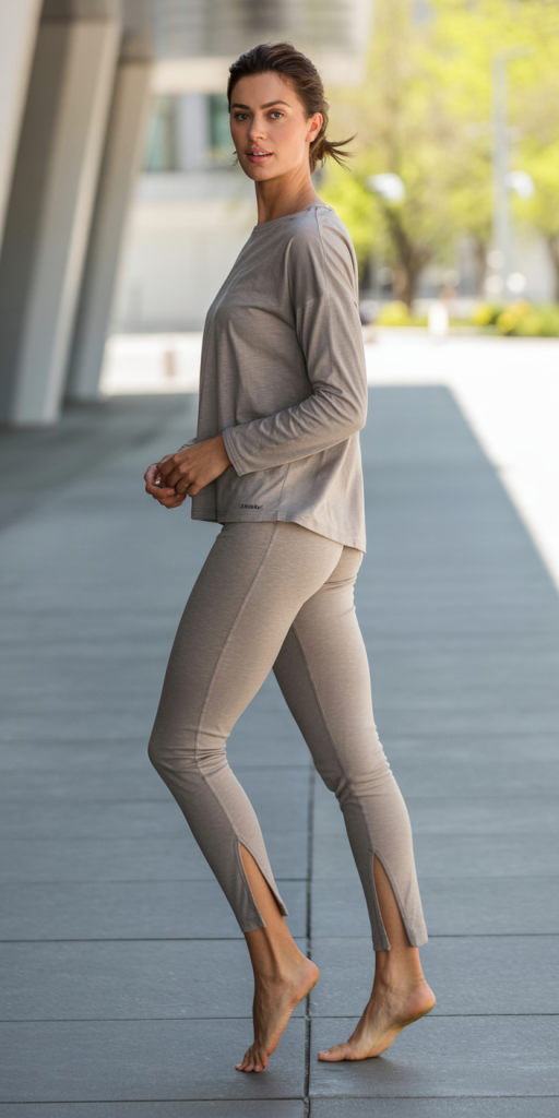 The “Soft Sculpt” trend is the cornerstone of Spring 2026. This outfit features high-waisted, buttery-soft leggings in a delicate lavender or soft taupe. The fabric is engineered to provide a “gentle hug,” smoothing the silhouette without the restrictive compression of traditional performance gear. Pair these with a matching longline sports bra to create a cohesive, elongated look that is perfect for restorative yoga or Pilates.