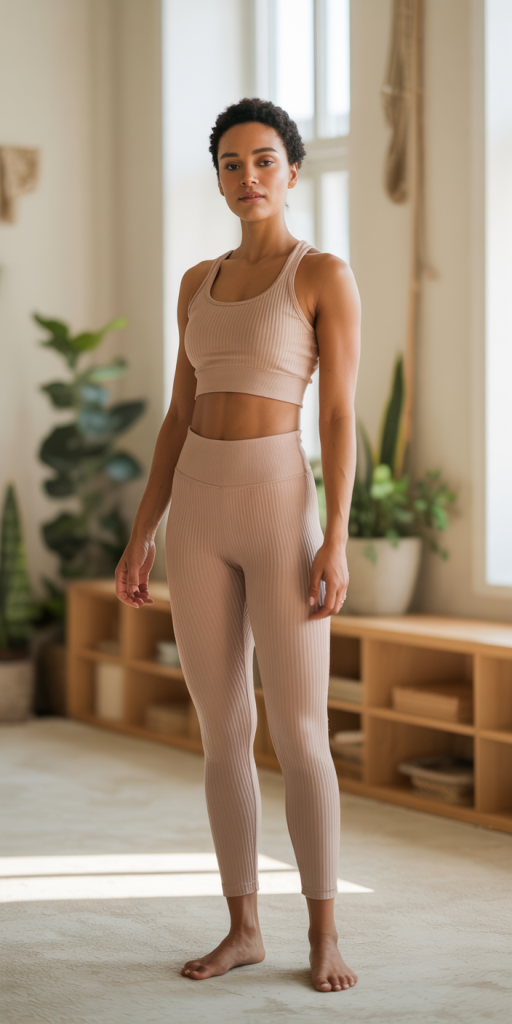 Texture plays a vital role in 2026 fashion. A monochrome set in warm beige or clay brown featuring a ribbed texture adds depth to a simple silhouette. The ribbed fabric provides a subtle compression and a premium feel. A matching ribbed crop top and high-waisted leggings create a sophisticated, grounded look that mirrors the natural tones of the spring season.