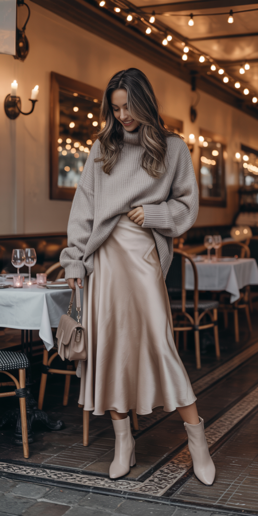 This outfit is all about the interplay of textures. The lustrous sheen of a satin midi skirt contrasts beautifully with the soft, cozy appeal of a chunky cashmere sweater. This combination is perfect for a more relaxed yet still romantic date, like a cozy dinner or a wine bar. Tucking the front of the sweater into the skirt defines the waist and keeps the silhouette from becoming bulky. Ankle boots or pumps can complete this effortlessly elegant look.