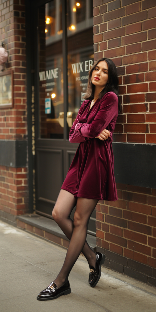 Velvet is a quintessential winter fabric, and its plush texture is inherently romantic. A velvet mini dress in a rich color like burgundy or forest green is a festive choice for Valentine’s Day. To keep the look from feeling too formal or overtly sexy, pair it with sheer black tights and a pair of classic loafers. This unexpected footwear choice grounds the outfit and adds a touch of preppy, intellectual charm.