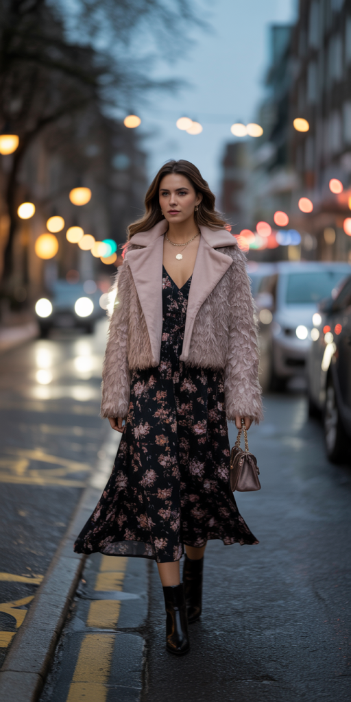 Florals for Valentine’s Day can feel predictable, but a modern interpretation keeps the look fresh. A midi-length floral dress in a darker, moodier print feels more appropriate for a winter evening than a bright, summery pattern. Paired with a trendy short faux-fur jacket, the outfit becomes both playful and glamorous. The textural contrast between the soft fur and the flowing dress fabric adds another layer of visual interest.