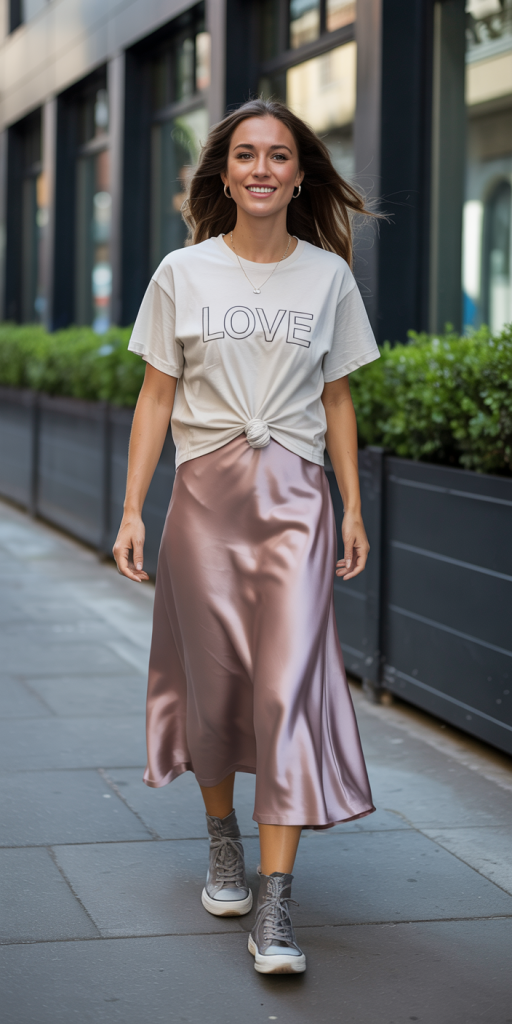 This combination is the epitome of the “cool girl” aesthetic, blending casual and formal elements for a look that is effortlessly chic. A graphic t-shirt, perhaps with a subtle love-themed message or band logo, tucked into a lustrous satin midi skirt creates a dynamic and youthful outfit. Paired with sneakers or ankle boots, this ensemble is perfect for a more alternative or low-key Valentine’s celebration, such as a concert or a movie night.