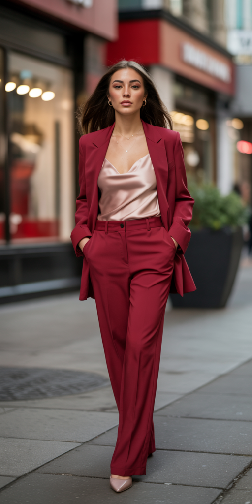 A monochromatic ensemble in a bold color like red or a soft hue like pink makes a powerful and fashion-forward statement. A tailored suit, consisting of a blazer and matching trousers, is a contemporary and chic option that moves beyond traditional Valentine’s Day attire. This look is not only comfortable but also exudes confidence. It can be dressed down with a simple white t-shirt and sneakers or dressed up with a silk camisole and heels, making it adaptable for various types of celebrations.