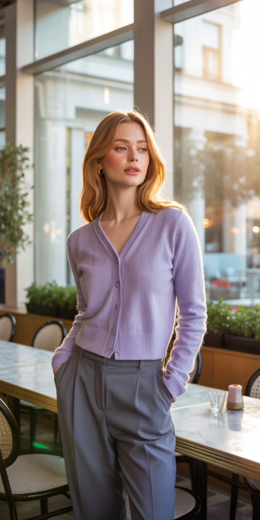 For a softer, more understated approach, a pastel-colored cardigan paired with high-waisted trousers offers a look that is both polished and sweet. A fine-knit cardigan in a shade like lavender, baby blue, or mint green can be worn buttoned up as a top or open over a simple camisole. When tucked into tailored high-waisted trousers, it creates a clean, elongated line, resulting in an outfit that is both comfortable for all-day wear and effortlessly elegant.