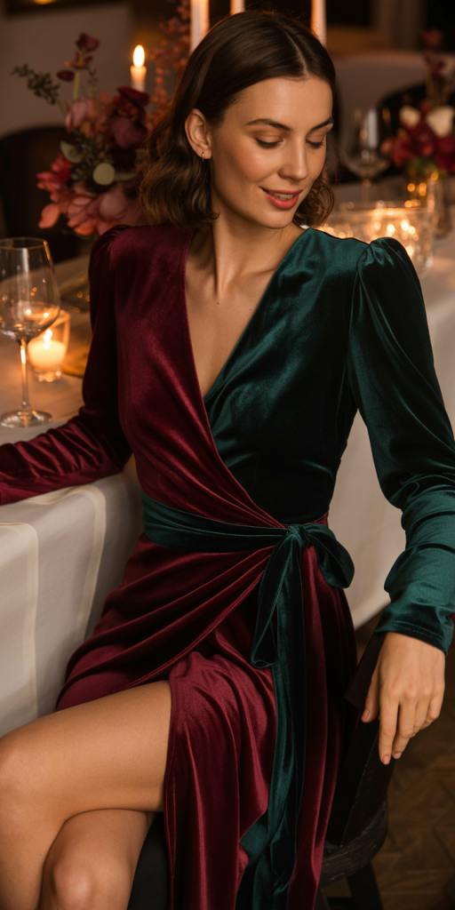 | Velvet Wrap Dress | Simple heels, elegant flats | Pearl or diamond stud earrings, a delicate bracelet |