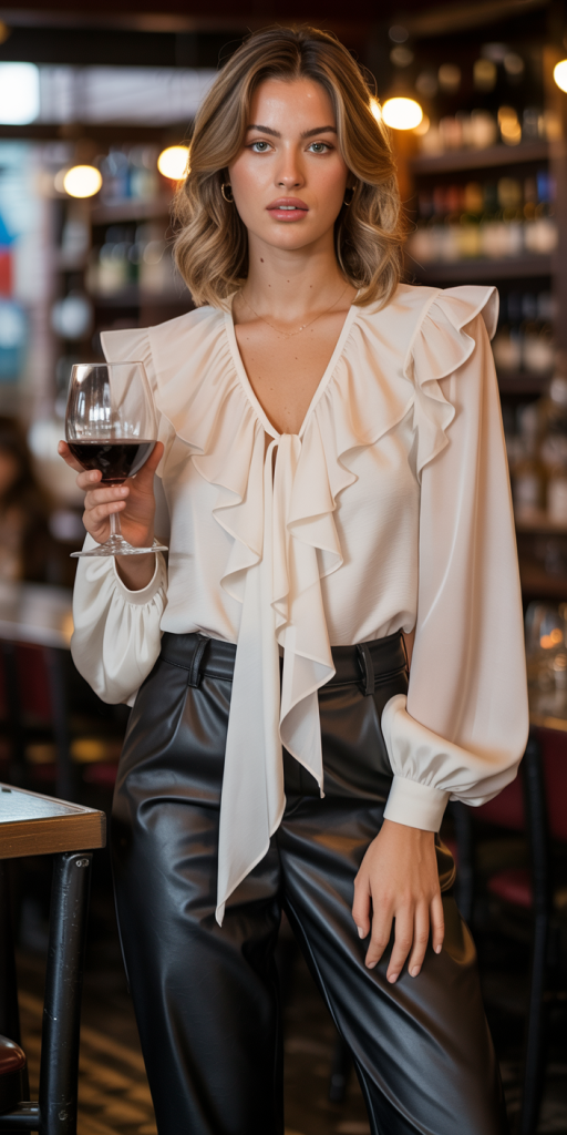 For an outfit that combines edginess with classic romance, pair faux leather trousers with a soft, romantic blouse. The structure and sheen of the leather provide a modern base, which is beautifully softened by a blouse featuring details like ruffles, lace, or voluminous sleeves. This juxtaposition of hard and soft elements creates a balanced and intriguing look that is both comfortable and stylish, suitable for an evening out or a special event.