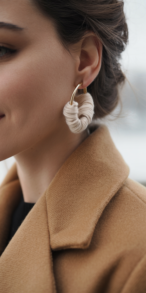 - Conclude the section with Cashmere-Wrapped Huggies. These are small, close-fitting huggie hoops partially wrapped in a fine, soft cashmere thread, a subtle way to incorporate luxury texture. They are ideal for everyday wear, providing a sophisticated, understated warmth.