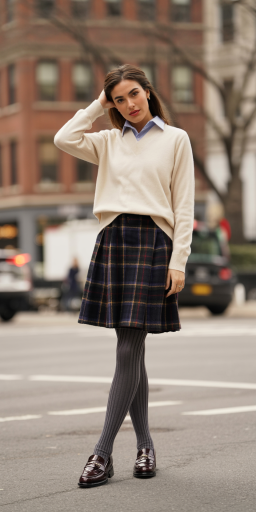 Outfit 1: The Modern Prep Look. This sophisticated take on collegiate style is perfect for a polished daytime look. Combine a High-V-Neck Sweater with a Plaid Skirt, Gray Tights (a key accessory trend [1]), and classic Loafers.