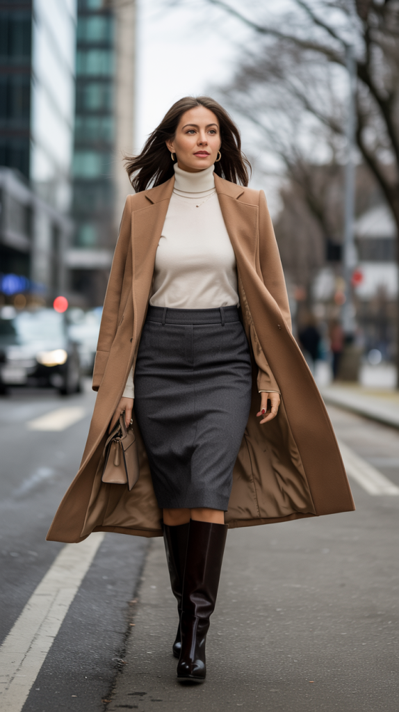 Outfit 17: Polished Pencil. Pair a Wool Pencil Skirt with a Fitted Turtleneck and a Longline Coat. This polished ensemble is best worn with Knee-High Boots and delicate gold jewelry.