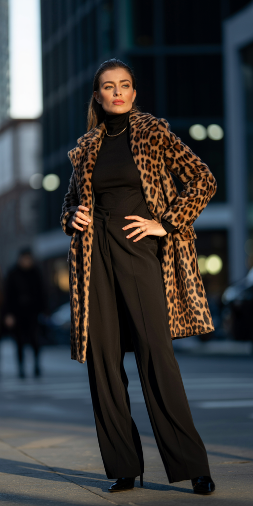 Outfit 2: The Statement Leopard. Leopard print is back as a dominant statement piece [2]. Let the Leopard-Print Coat be the focus by keeping the rest of the outfit monochromatic with a Black Turtleneck, Wide-Leg Trousers, and Ankle Boots.