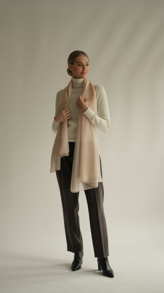 Outfit 14: Cashmere & Silk. Combine the luxury of a Cashmere Sweater with a Silk Scarf (worn under your coat) and Tailored Pants. Sleek ankle boots and minimalist jewelry complete this refined look.