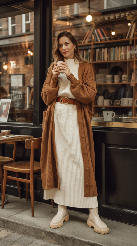 Outfit 13: Knit Dress Duo. A Knitted Midi Dress is instantly elevated when paired with a Long Cardigan and cinched at the waist with a Belt. Wear with Stompy Lug-Sole Boots and thick tights for a chic, warm ensemble.