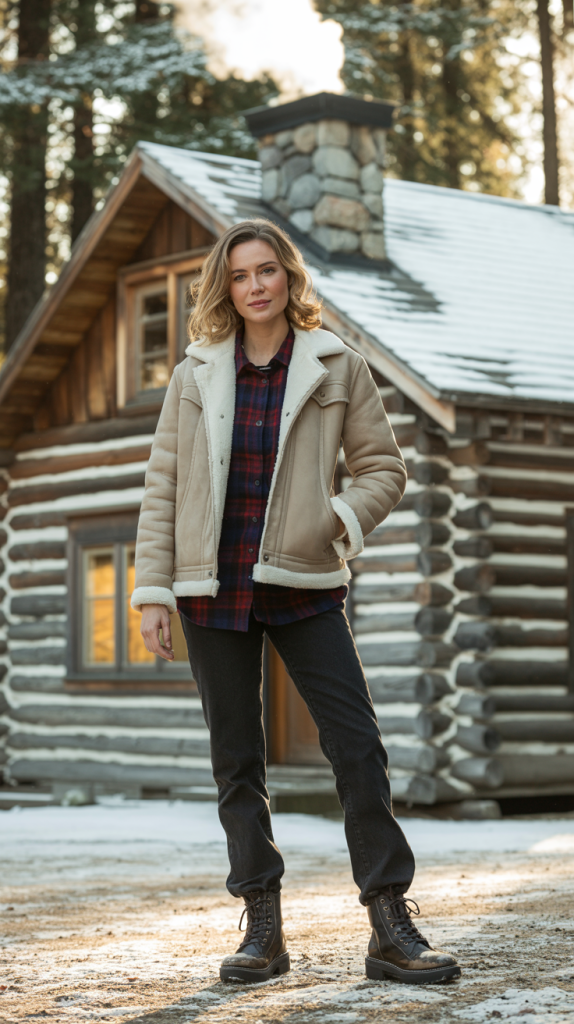 Outfit 10: The Shearling Moment. Pair a cozy Shearling Jacket with a Flannel Shirt and Dark Wash Denim. Finish the outfit with Combat Boots and a knit scarf.