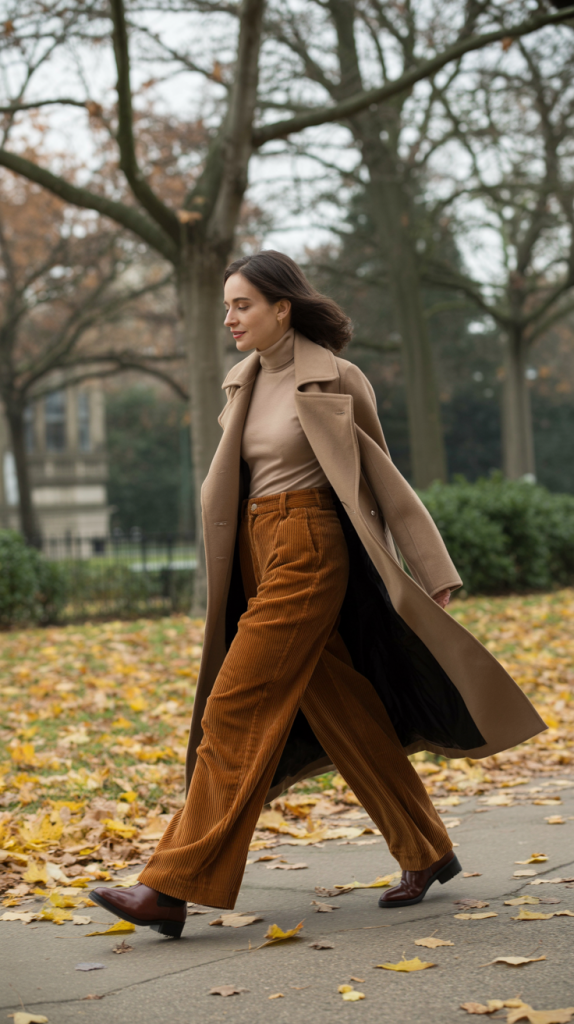 Outfit 9: The Trench Layer. Layer a Wool-Lined Trench Coat over a thin Turtleneck and Wide-Leg Corduroy Pants. This look is completed with classic Chelsea Boots and a crossbody bag.