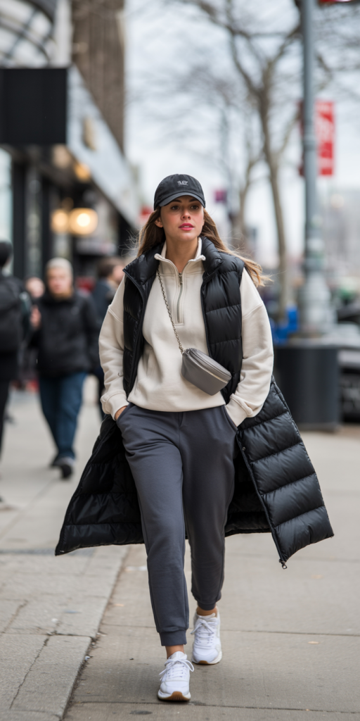 Outfit 22: Errands Chic. For a quick and stylish look, layer a Long Puffer Vest over a Half-Zip Sweater and Joggers. A Baseball Cap and a functional crossbody bag complete this practical ensemble.