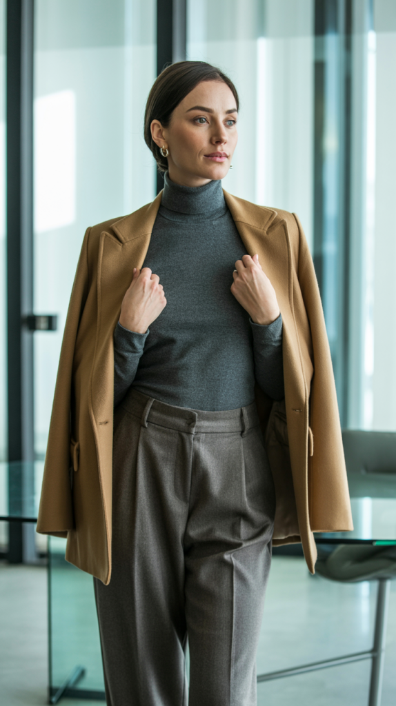 Outfit 12: The Layered Turtleneck. Layer a thin Turtleneck under an Oversized Blazer and pair with Wool Trousers. This professional look can be finished with pointed-toe flats or loafers.