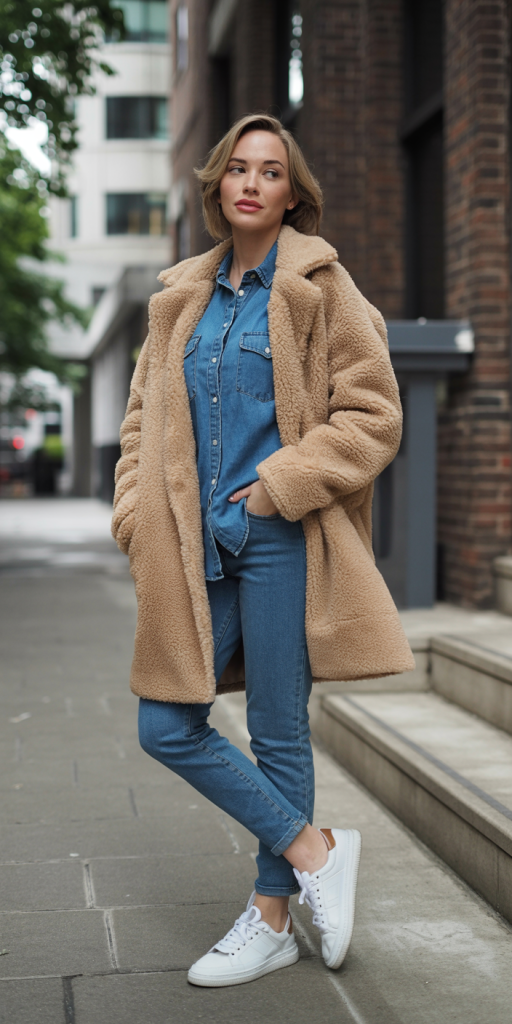 Outfit 20: Denim on Denim. A simple yet stylish combination of a Denim Shirt and Dark Wash Jeans. Layer with a textured Teddy Coat and finish with casual sneakers and simple gold hoops.