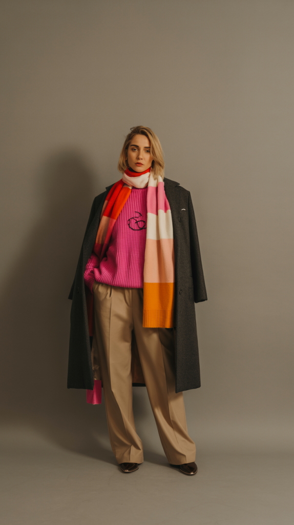 Outfit 5: Curious Color Combinations. Break up the typical winter neutrals by experimenting with unexpected color pairings. Try a bold color-blocked outfit, such as bright knitwear with a contrasting scarf, worn over Wool Trousers and under a Structured Coat [3].