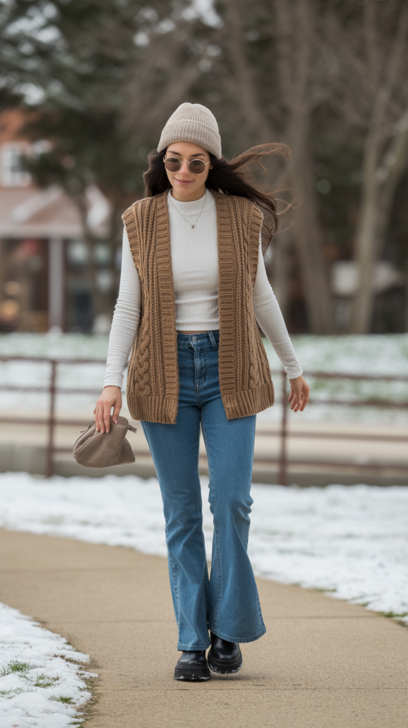 Outfit 15: Thermal Base Chic. Use a thermal top and leggings as a base layer, then layer with Flared Jeans, a Chunky Knit Vest, and a Chunky Knit. Finish with Waterproof Boots and wool socks.