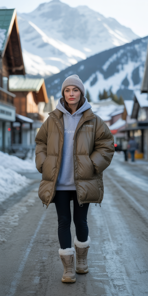 Outfit 7: The Puffer Power. Embrace the cold with an Oversized Puffer Jacket layered over an Oversized Hoodie and Fleece-Lined Leggings. Complete this practical, warm look with Snow Boots and a Beanie.