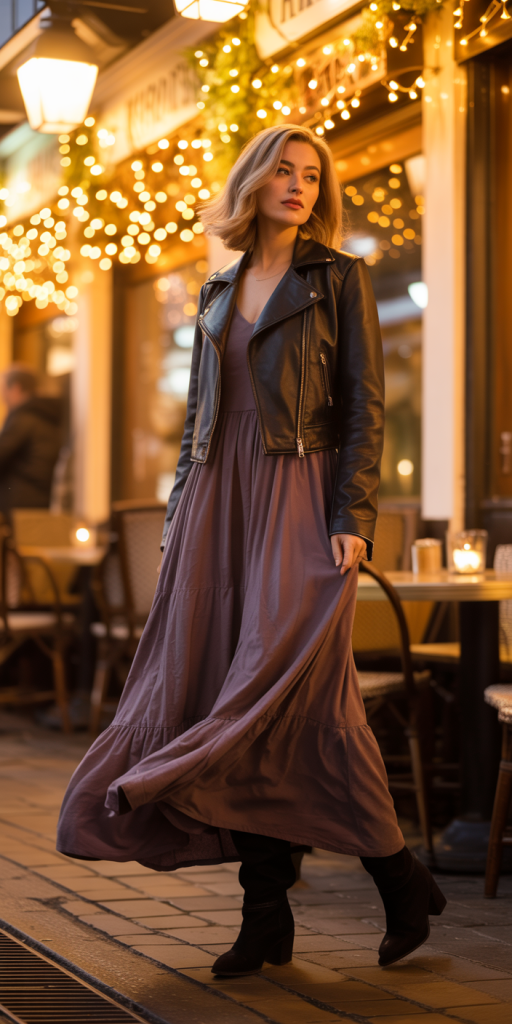 - Flowy Maxi Dress & Leather Jacket: Bring your favorite maxi dress into winter by styling it with a cropped leather jacket and heeled boots. The mix of soft and tough textures is always a winner.