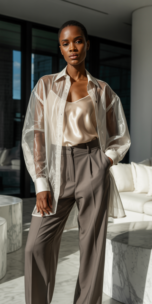 - Sheer Blouse & Trousers: A sheer or organza blouse adds a touch of romance and mystery. Wear a simple cami underneath and pair it with high-waisted trousers for a chic, elegant look.