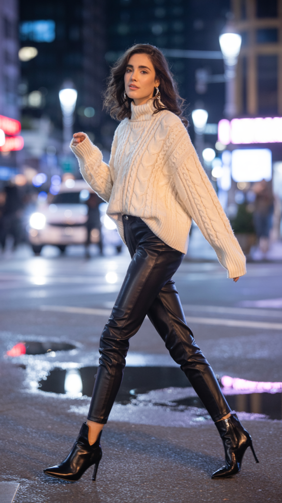 - Leather Pants & a Cozy Knit: Faux leather pants are a winter essential. They instantly add an edge to any outfit. Balance their sleekness with an oversized, soft sweater and finish with heeled ankle boots.