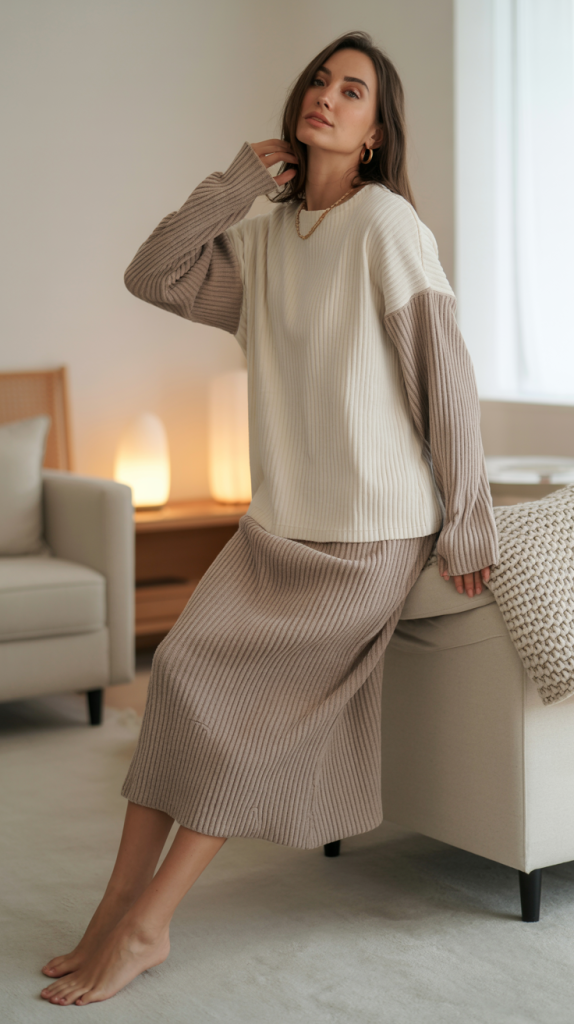 - The Knit Co-ord Set: A matching knit top and skirt or pants set is an easy way to look polished. It’s comfortable, warm, and requires minimal effort to style.