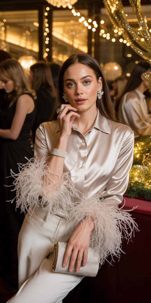- Feather-Trimmed Everything: Feathers are a fun, festive trend. Look for feather-trimmed cuffs on a blouse, the hem of a dress, or even on your accessories for a playful party look.