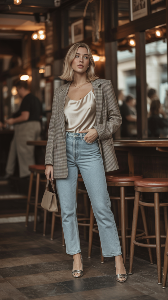 - The Elevated Denim Look: Start with your favorite jeans—whether they’re straight-leg, flared, or wide-leg. Pair them with a silky camisole and a sharp blazer, or a chunky knit sweater for a cozier feel.