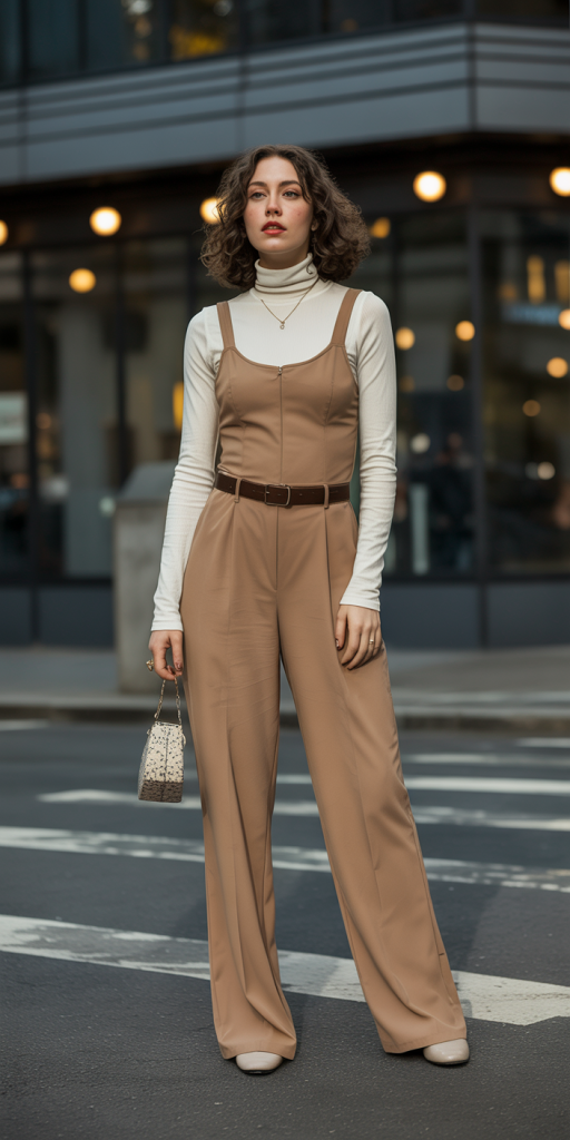 - Jumpsuit & Turtleneck: A long-sleeved jumpsuit is a one-and-done outfit. For extra warmth and a touch of ’70s flair, layer a thin turtleneck underneath.