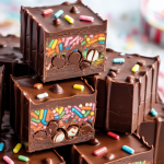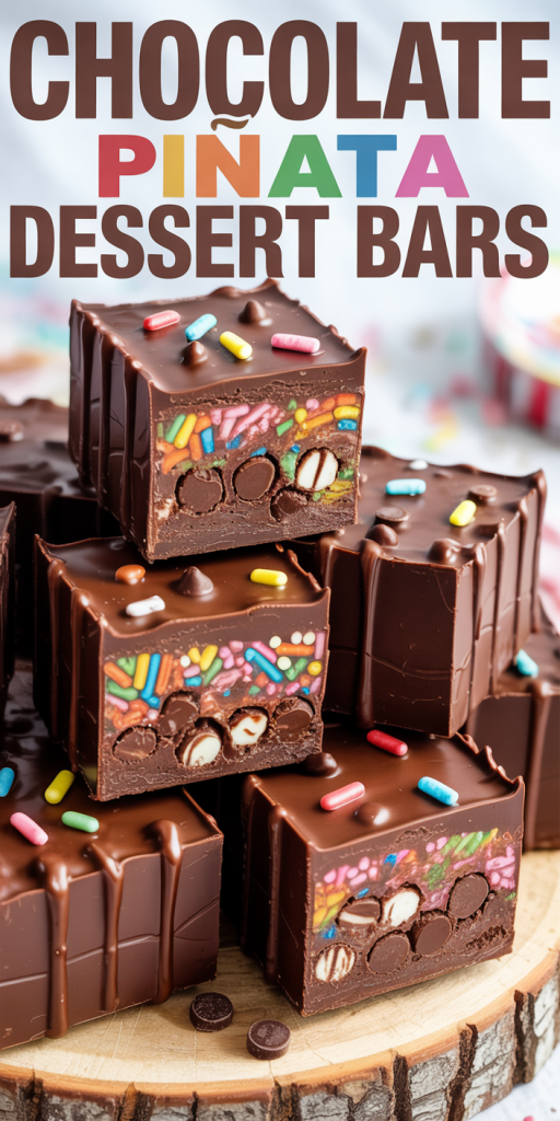 Chocolate Piñata Dessert Bars are a playful and indulgent treat made from a rich, chocolatey shell filled with a mix of sweet ingredients that can include candies, fruits, or even cake. The concept combines the excitement of breaking open a piñata filled with goodies, but in a more accessible format. Imagine slicing into a bar only to discover a surprise-filled center that spills out into a colorful, sugary delight. This dessert bar is not just about taste, it’s about the experience, making it perfect for celebrations or just an extravagant dessert for us to enjoy.