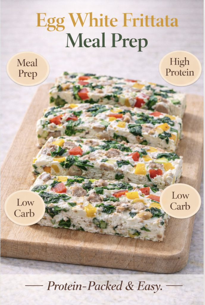 Method: Sauté veggies, mix with eggs, turkey sausage, and cheese. Bake at 350°F for 20–25 minutes. Slice into 4 portions. Each portion: ~16–18 g protein. Serve with a slice of whole-grain toast or fruit.