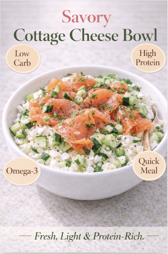 Method: Combine cottage cheese with herbs and lemon zest, top with smoked salmon and cucumber. Ready in minutes. Total protein: ~37–40 g. Great for low-carb days and quick recovery mornings.