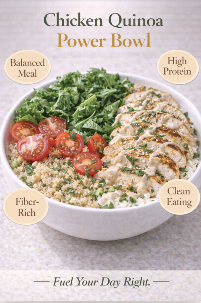 Method: Assemble bowl with quinoa, greens, and sliced chicken. Drizzle dressing. Approx protein: 40–45 g. Quinoa adds fiber and plant protein.