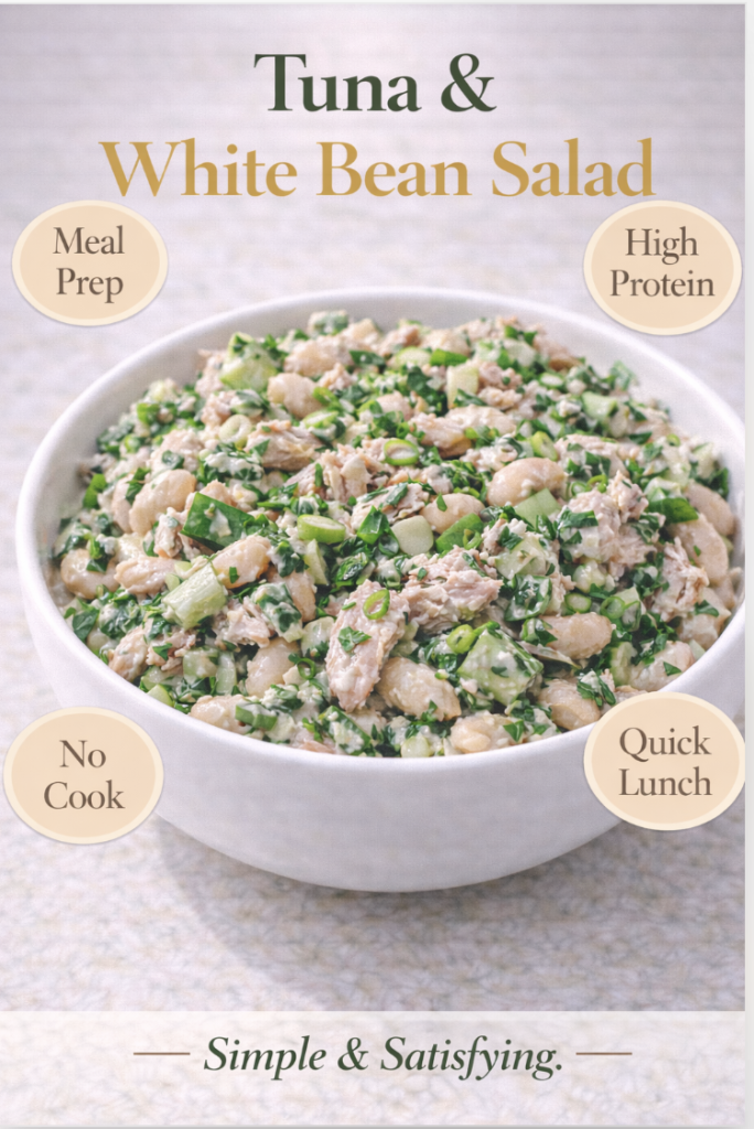 Method: Mix drained tuna and beans with the yogurt dressing. Season to taste. Per serving protein: ~32–33 g. This salad stores well for lunches and packs on-the-go.