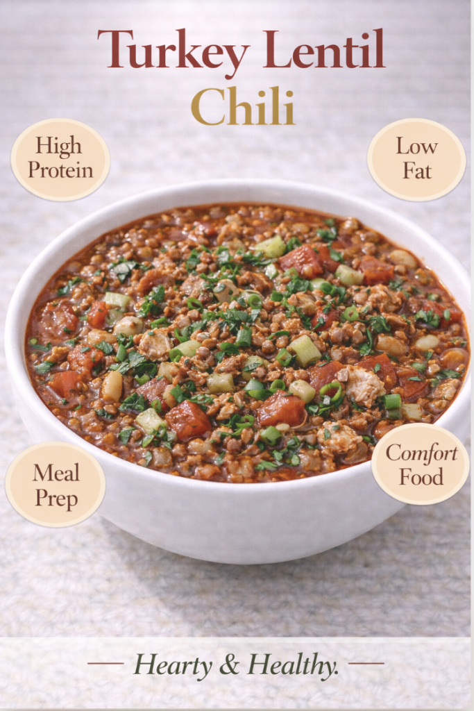 Method: Brown turkey, add aromatics and spices, stir in lentils and tomatoes, simmer until lentils are tender. Each serving: ~21–25 g protein. Use Greek yogurt or avocado for topping.